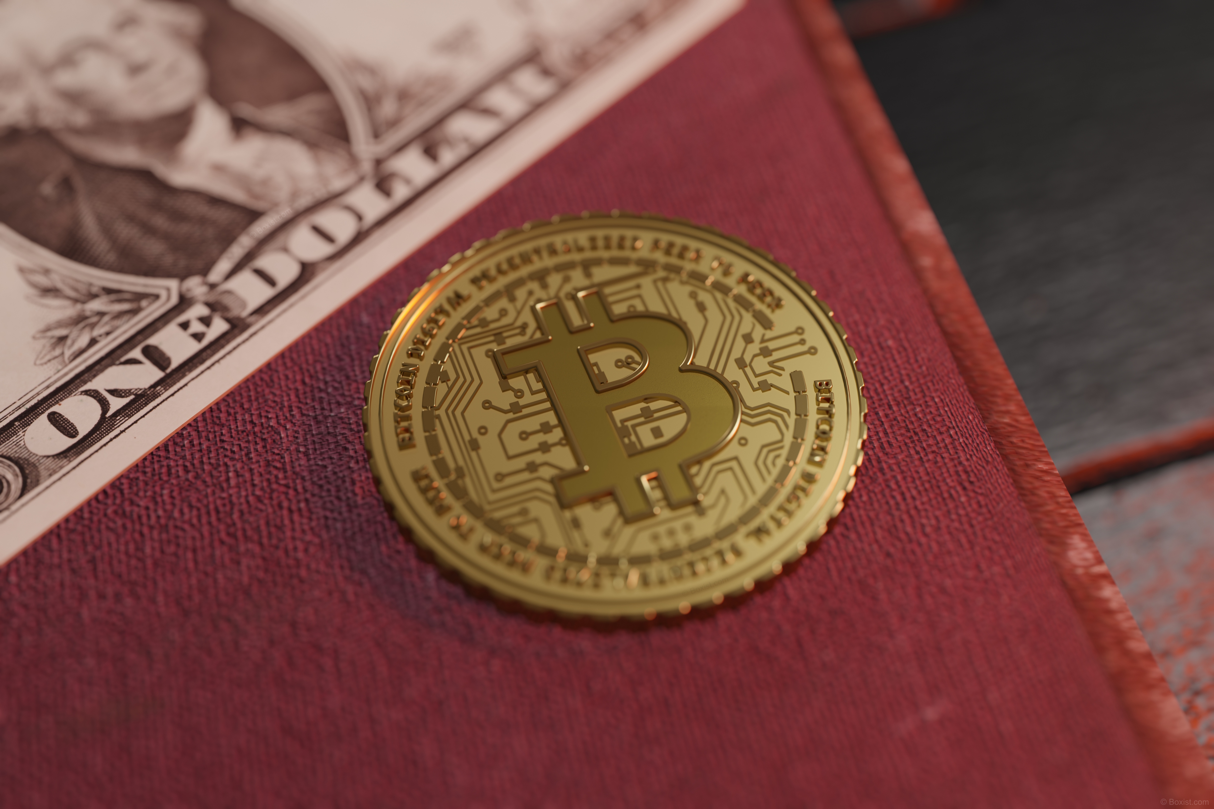 In this closeup image, we observe a captivating juxtaposition of old and new, as a shiny golden Bitcoin, representing modern cryptocurrency, is placed on top of an old, grunge paled red leather cover of a book. The golden hue of the Bitcoin contrasts beautifully with the weathered texture of the leather cover, creating a visually striking composition that merges the past with the present. Beside the Bitcoin, a part of a one-dollar bill is placed, further adding to the juxtaposition of traditional currency with the emerging world of cryptocurrency. The worn texture of the dollar bill complements the aged appearance of the book cover, reinforcing the theme of the passage of time and evolution. Overall, this image invites contemplation on the intersection of finance, technology, and history. It prompts reflection on the changing landscape of currency and the enduring value of knowledge and tradition in an ever-evolving world.