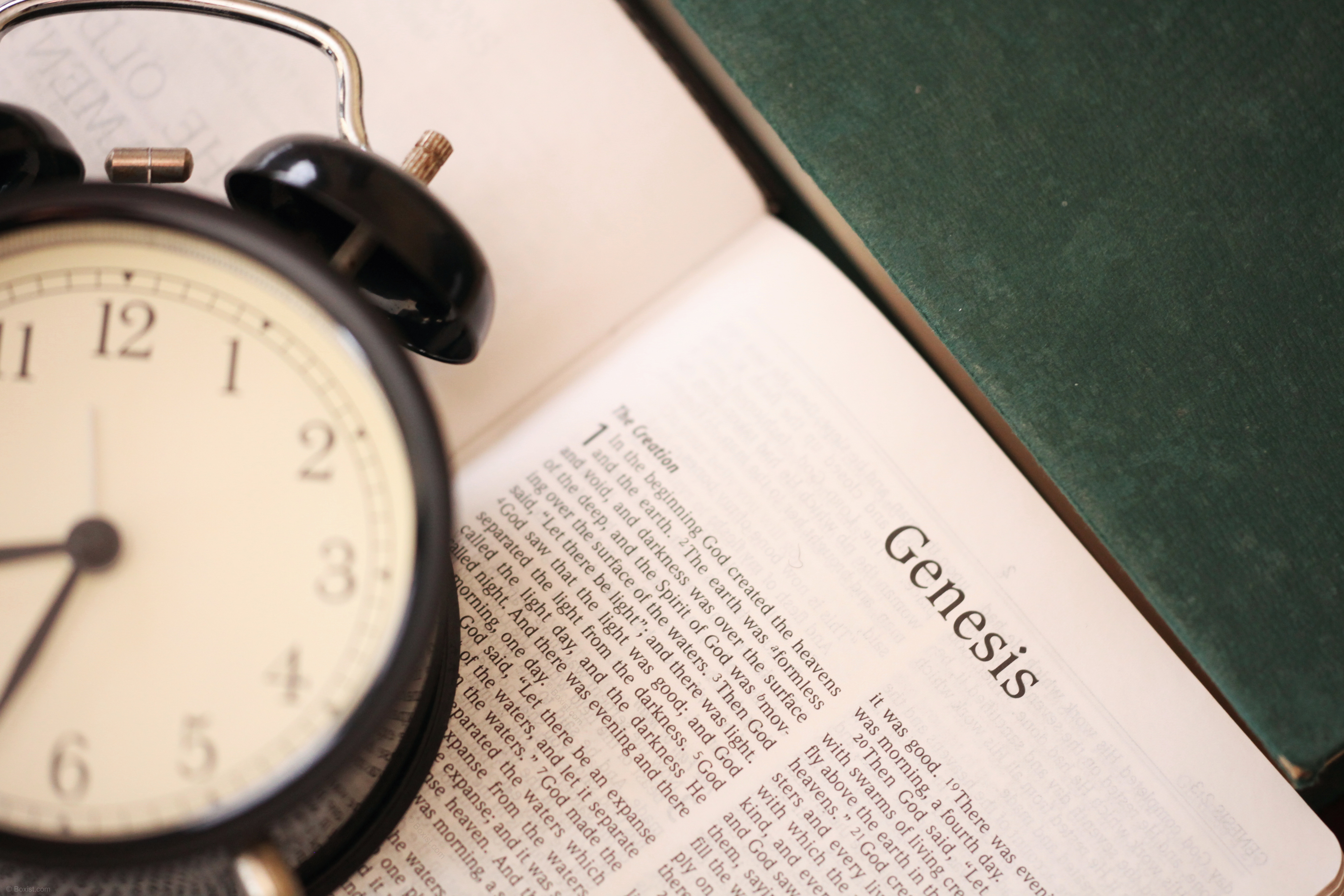 This image presents a captivating view of an open book of the Holy Bible, with its pages displaying the book of Genesis. The timeless words of scripture are laid bare, inviting contemplation and reflection on the origins of creation and the divine narrative. Resting atop the open book is a clock, serving as a poignant symbol of the passage of time. Its hands move steadily, reminding viewers of the temporal nature of existence and the ever-flowing stream of moments that shape our lives. This evocative composition invites viewers to ponder the intersection of sacred scripture and the passage of time, prompting contemplation on the eternal truths contained within the pages of the Bible and the transient nature of human existence.