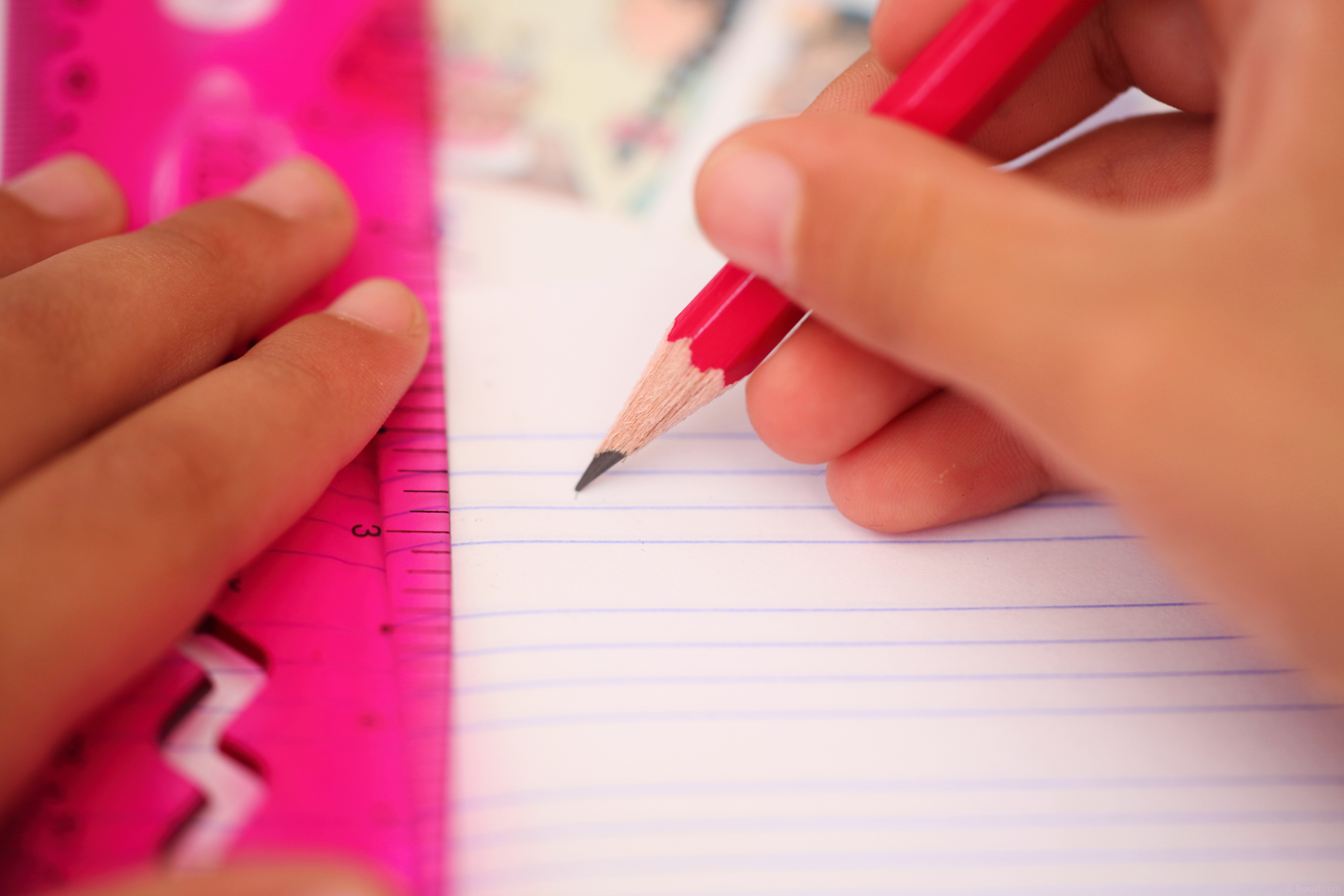 In this close-up view, we see the hand of a child poised and ready to begin writing with a dark pink pencil. The child’s hand hovers over lined yellow paper, indicating a desire to start a new creative endeavor or academic task. The paper provides a structured canvas for the child to express themselves, with the ruled lines guiding their writing and keeping it neat and organized. In the child’s other hand, a ruler is held, suggesting a careful and deliberate approach to their work. The ruler may be used to draw straight lines, create geometric shapes, or assist in measuring and aligning elements on the paper. Overall, this image captures the sense of anticipation and excitement that comes with embarking on a new writing or drawing project. It reflects the child’s curiosity, enthusiasm, and determination to learn and create, highlighting the importance of education and self-expression in their development.