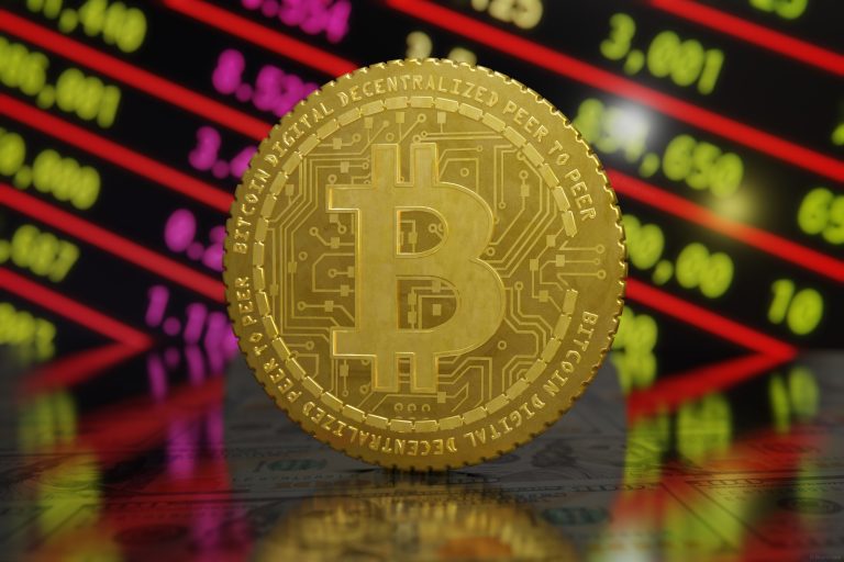 In this closeup 3D design image, we are presented with the right top corner of a computer keyboard, featuring large black buttons. The capslock key stands out with its distinctive red color, adorned with the text “BITCOIN” and a symbol of a lock, symbolizing security and encryption. Above the keyboard float two shiny golden symbols of the crypto Bitcoin currency, adding a touch of elegance and significance to the scene. These symbols represent the growing influence and prominence of Bitcoin in the digital world. The keyboard is set against an abstract black background, where digital green numbers of zero and one binary numbers seem to be in motion. This dynamic backdrop enhances the futuristic and technological theme of the image, evoking the fast-paced nature of the digital landscape. Overall, this image captures the intersection of technology and finance, highlighting the rise of cryptocurrencies like Bitcoin in the digital age. It conveys a sense of innovation, security, and potential, inviting viewers to contemplate the future of digital currencies and their impact on the global economy.