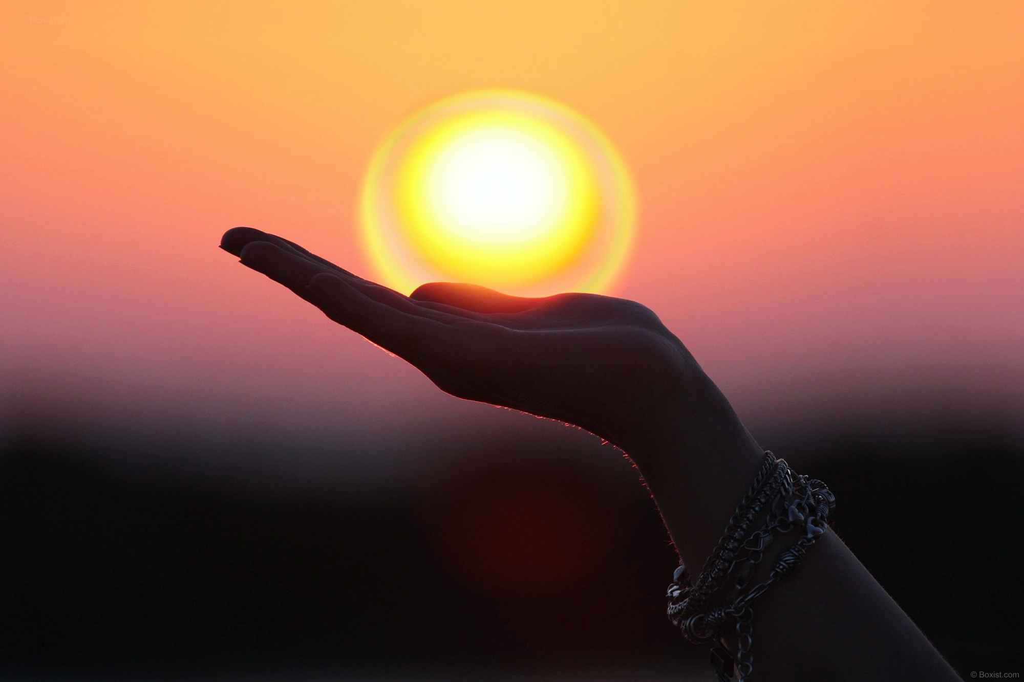 In this serene and captivating image, a woman’s hand is depicted with her palm open against the backdrop of a mesmerizing sunset. Behind her hand, a large yellow sun radiates with glowing light, casting a warm and comforting glow. A soft yellow halo surrounds the sun, creating a halo effect that adds to its ethereal beauty. The sun appears to be cradled gently within the woman’s hand, symbolizing her connection to the natural world and the universe. The gesture suggests a sense of reverence and awe, as if she is holding the source of light and life itself. The sky is painted with a stunning array of colors, blending shades of orange, yellow, pink, and dark hues. The blurry effect adds to the dreamlike quality of the scene, creating a sense of tranquility and peace. Overall, this view captures the beauty and wonder of nature, as well as the intimate connection between humanity and the cosmos. It evokes feelings of warmth, serenity, and gratitude, inviting viewers to pause and appreciate the beauty that surrounds them.