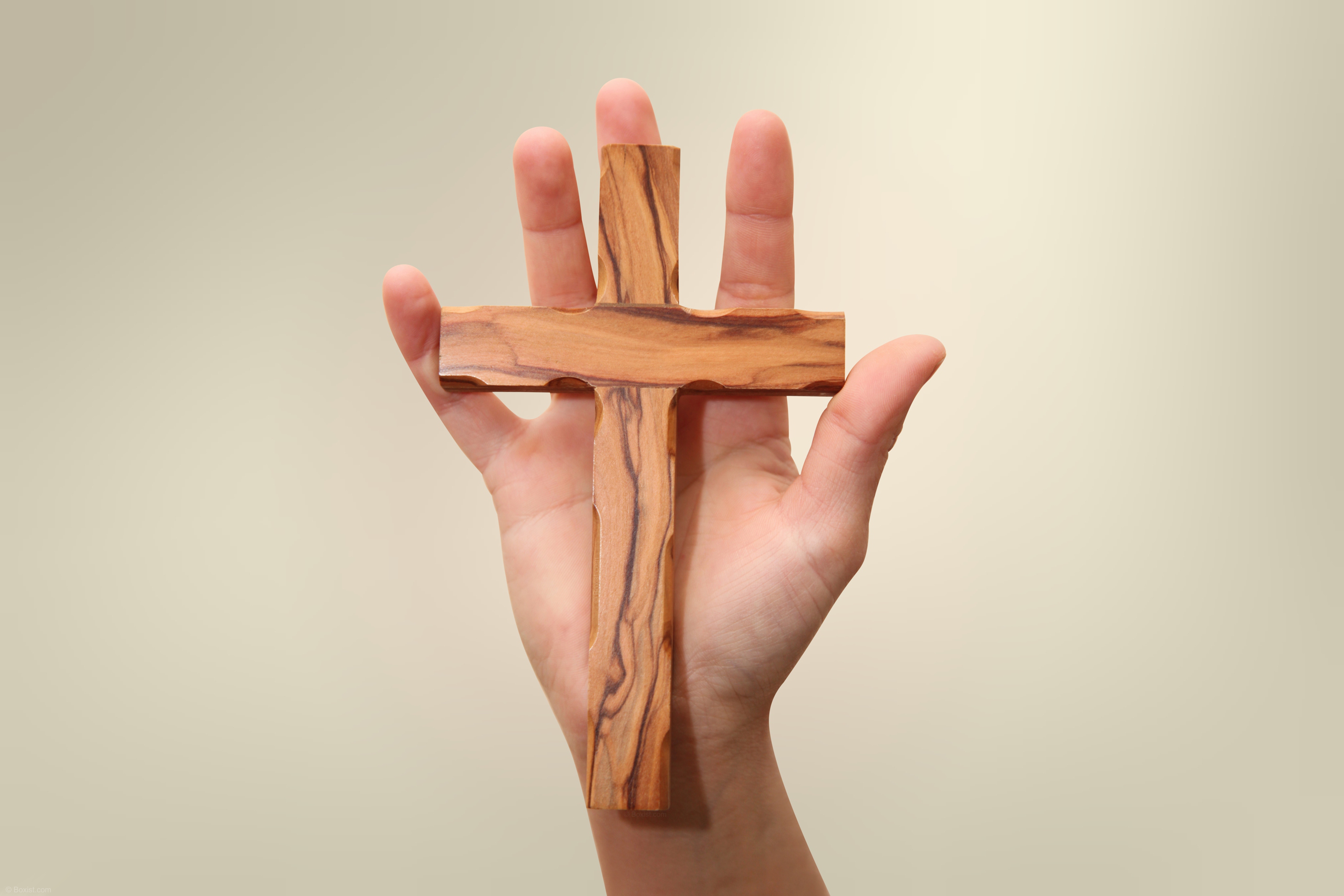 In this closeup image, we see the palm of a person’s hand raised with open fingers, serving as a gentle cradle for a wooden cross made from olive wood. The cross hangs delicately from the open hand, symbolizing reverence, faith, and spirituality. The hand and the cross are isolated against a bright cream background, emphasizing the purity and simplicity of the composition. The soft, neutral backdrop allows the intricate details of the wooden cross and the contours of the hand to stand out prominently. The choice of olive wood for the cross adds depth to its symbolism, as olive trees have long been associated with peace, wisdom, and spirituality in various cultures and traditions. Overall, this close-up view conveys a sense of reverence and devotion, inviting viewers to contemplate the significance of faith and spirituality in their lives. The image serves as a visual reminder of the enduring power of faith to provide comfort, guidance, and strength.