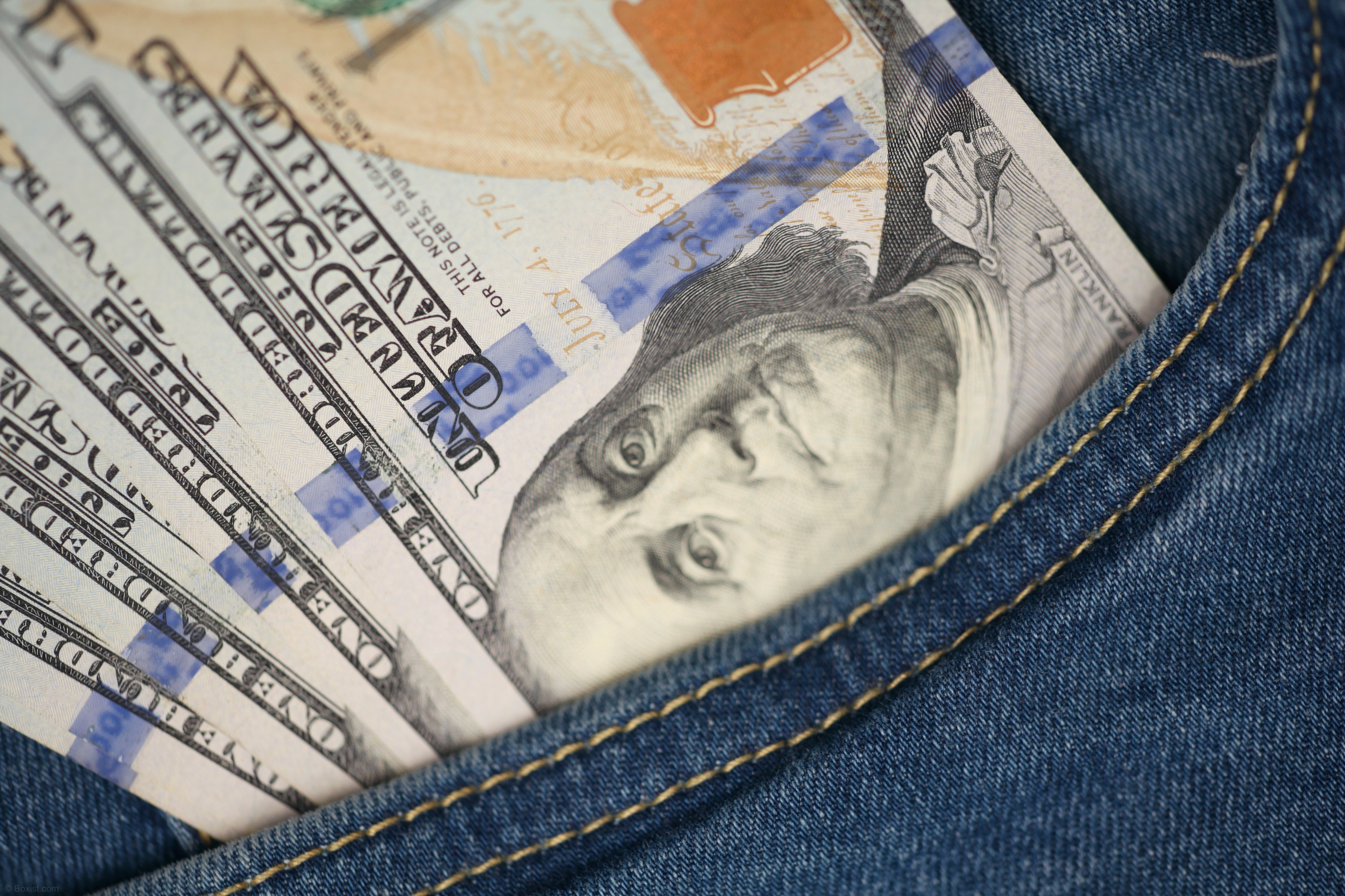 In this close-up image, we see the pocket of a blue denim jeans with a couple of hundred-dollar banknotes sticking out. The crisp details of the money, including the portrait of Benjamin Franklin, are clearly visible, adding a sense of realism to the image. The banknotes are neatly tucked into the pocket, partially exposed, suggesting a casual yet secure placement. The contrast between the blue denim fabric and the green color of the banknotes creates a visually striking composition. Overall, this image captures the intersection of everyday life and financial wealth, inviting viewers to contemplate the value and significance of money in modern society. It evokes a sense of curiosity and intrigue, prompting reflections on wealth, status, and the pursuit of success.