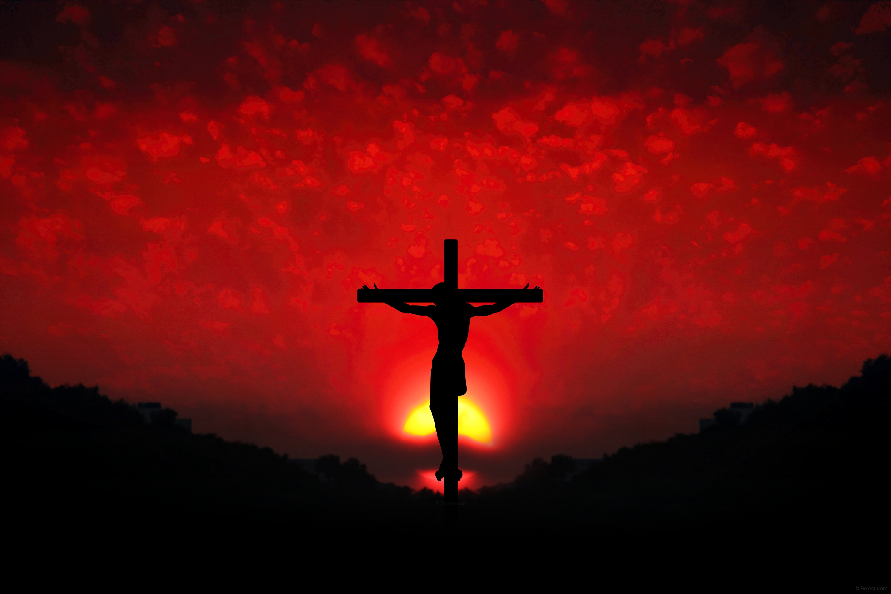 In this captivating image, the crucifixion of Jesus Christ is depicted against a stunning backdrop of nature’s beauty and majesty. The sky is painted with hues of dark red, with small clouds scattered across the horizon. The silhouette of mountains and valleys frames the scene, adding depth and dimension to the composition. In the center of the valley, the sun is seen descending below the horizon, casting a warm, golden glow amidst the red clouds. The juxtaposition of light and darkness creates a dramatic contrast, symbolizing the divine presence amidst earthly turmoil. In the foreground, the dark silhouette of Jesus Christ is portrayed hanging on the cross, his arms outstretched in an expression of love and sacrifice. Despite the darkness surrounding him, his figure stands out as a beacon of hope and redemption, offering solace to those who gaze upon him. Overall, this image captures the profound symbolism of the crucifixion within the grandeur of nature’s landscape, inviting contemplation and reflection on the eternal message of love and salvation embodied by Jesus Christ.