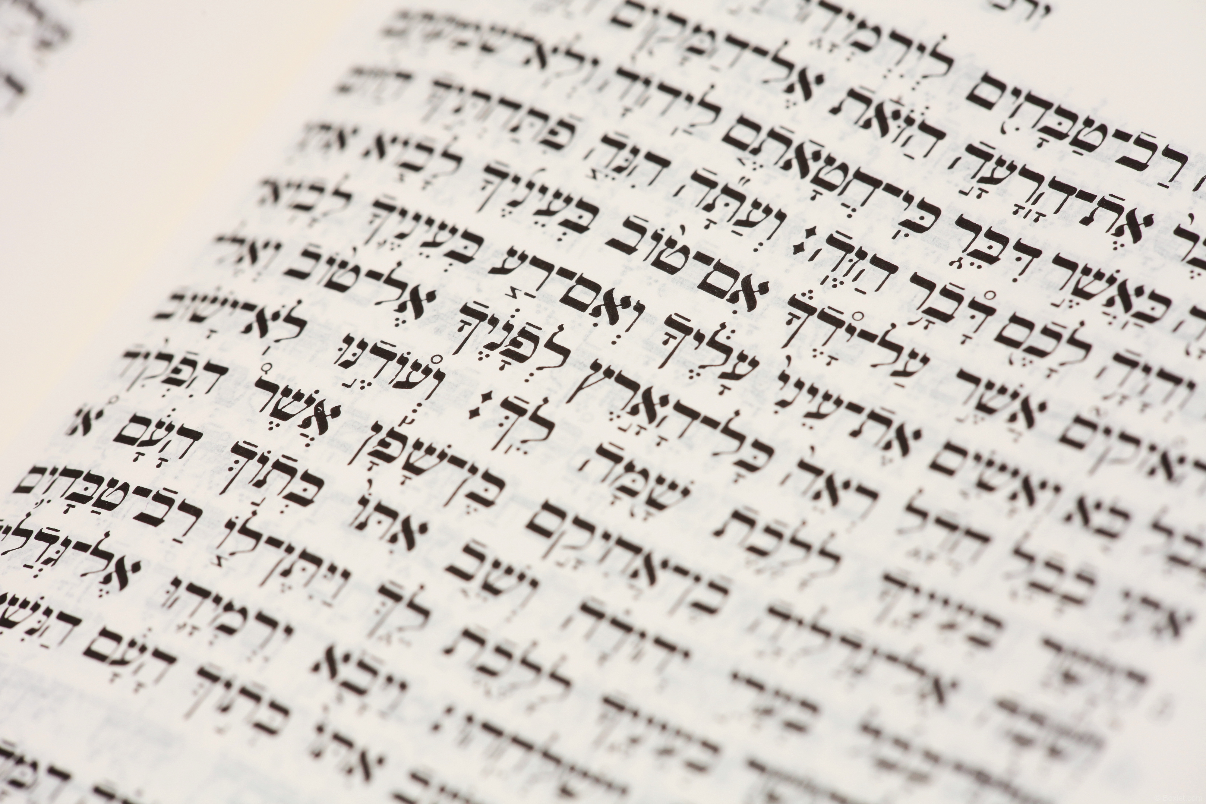 In this macro close-up image, we see an open page from the Jewish Old Testament Bible. The page is white, providing a stark backdrop for the Hebrew text printed in bold black. Despite the depth of field blurring some parts of the text, much of it remains sharply in focus, allowing for clear readability. This image offers a glimpse into the intricate details of the ancient scriptural text, inviting contemplation and reflection on its profound significance within Jewish tradition and culture.