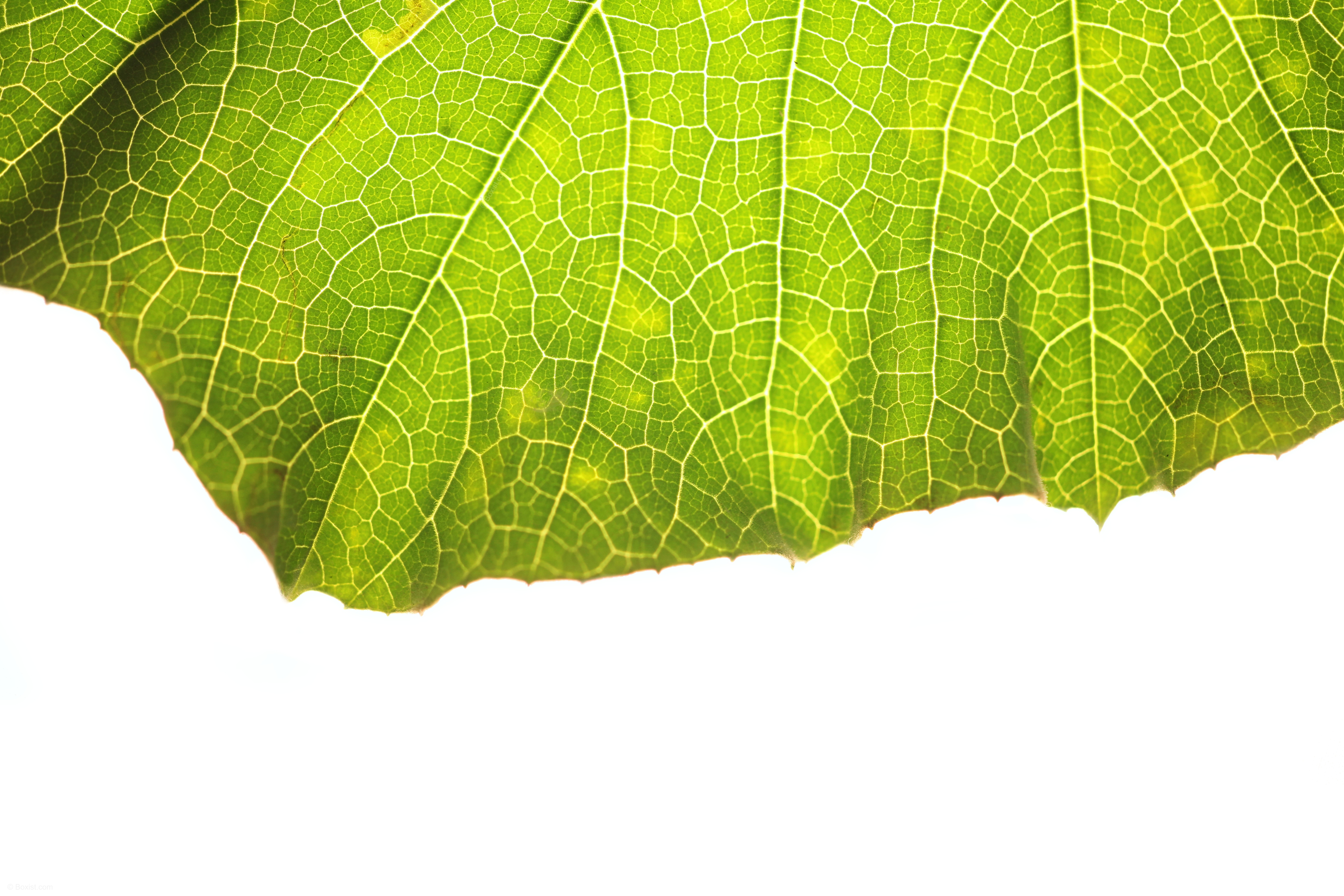 In this macro closeup image, a vibrant green leaf is isolated against a clean white background, allowing its intricate details to shine. The leaf’s surface is adorned with delicate veins, which branch out in intricate patterns, adding to the leaf’s natural beauty. Each vein serves as a miniature highway, transporting essential nutrients and water throughout the leaf, sustaining its life and contributing to its lush green color. The play of light and shadow accentuates the contours of the leaf, creating a captivating interplay of textures and tones. This close-up view offers a glimpse into the wondrous complexity of nature, inviting viewers to appreciate the exquisite beauty found in even the smallest details of the natural world.