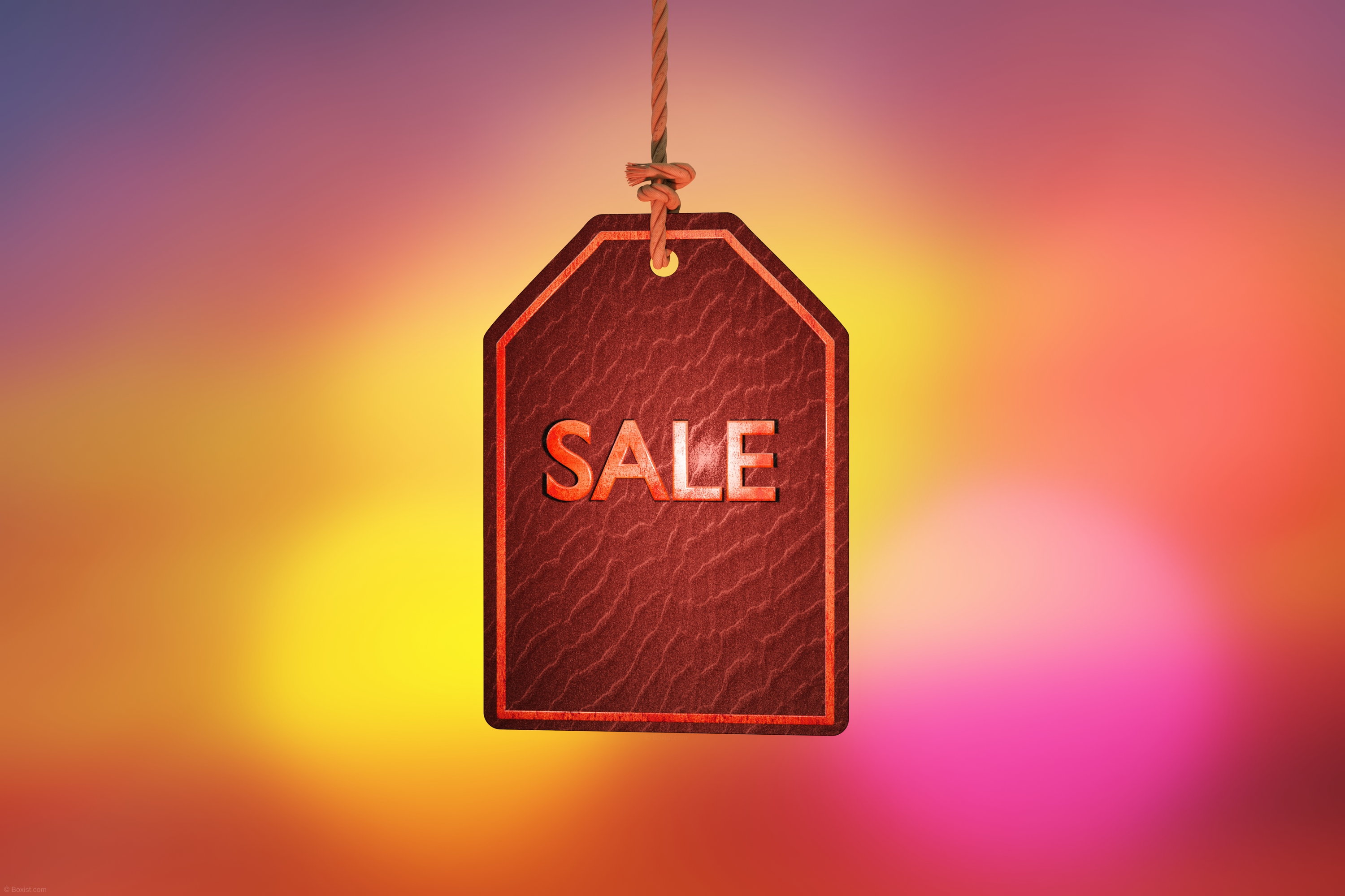In this image, a 3D design of a sale tag is showcased with intricate detail. The tag hangs delicately from a small thread, creating a sense of movement and dimensionality. The tag itself features bold lettering that reads “SALE,” conveying the message of discounted prices and promotions. Its three-dimensional design adds depth and realism to the scene, making the tag appear tangible and tactile. In the background, a colorful and blurry backdrop enhances the visual impact of the sale tag, creating a vibrant and dynamic setting. The blurred background adds a sense of depth and contrast, allowing the sale tag to stand out prominently in the foreground. Overall, this close-up view offers a captivating depiction of a sale tag, inviting viewers to engage with the excitement and energy of retail promotions and discounts.