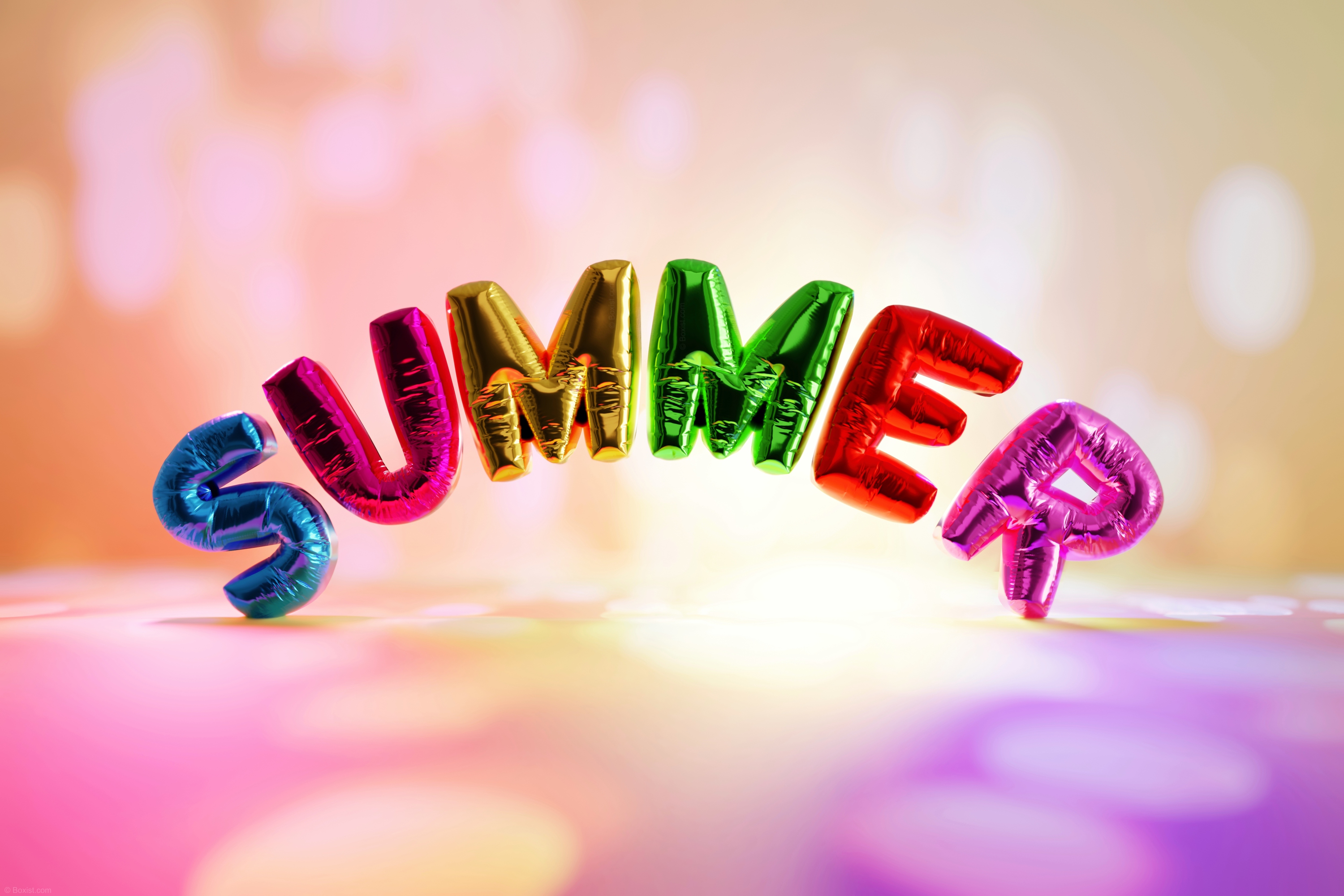 In this vibrant and playful 3D design image, we are presented with the word “Summer” made from individual balloon-shaped letters. Each letter is depicted as a colorful balloon floating in the air, forming a curved shape that spells out the word “Summer.” The balloons are arrayed in a spectrum of colors, adding a lively and dynamic element to the composition. As the first and last balloons rest on the surface, the others appear to be suspended in mid-air, creating a sense of movement and buoyancy. The surface and background are rendered in colorful and blurry tones, with a depth of field effect adding depth and dimension to the scene. This effect draws the viewer’s attention to the whimsical arrangement of the balloon letters, evoking a sense of joy and excitement associated with the summer season. Overall, this image captures the carefree and exuberant spirit of summer, inviting viewers to embrace the warmth and vibrancy of the season.