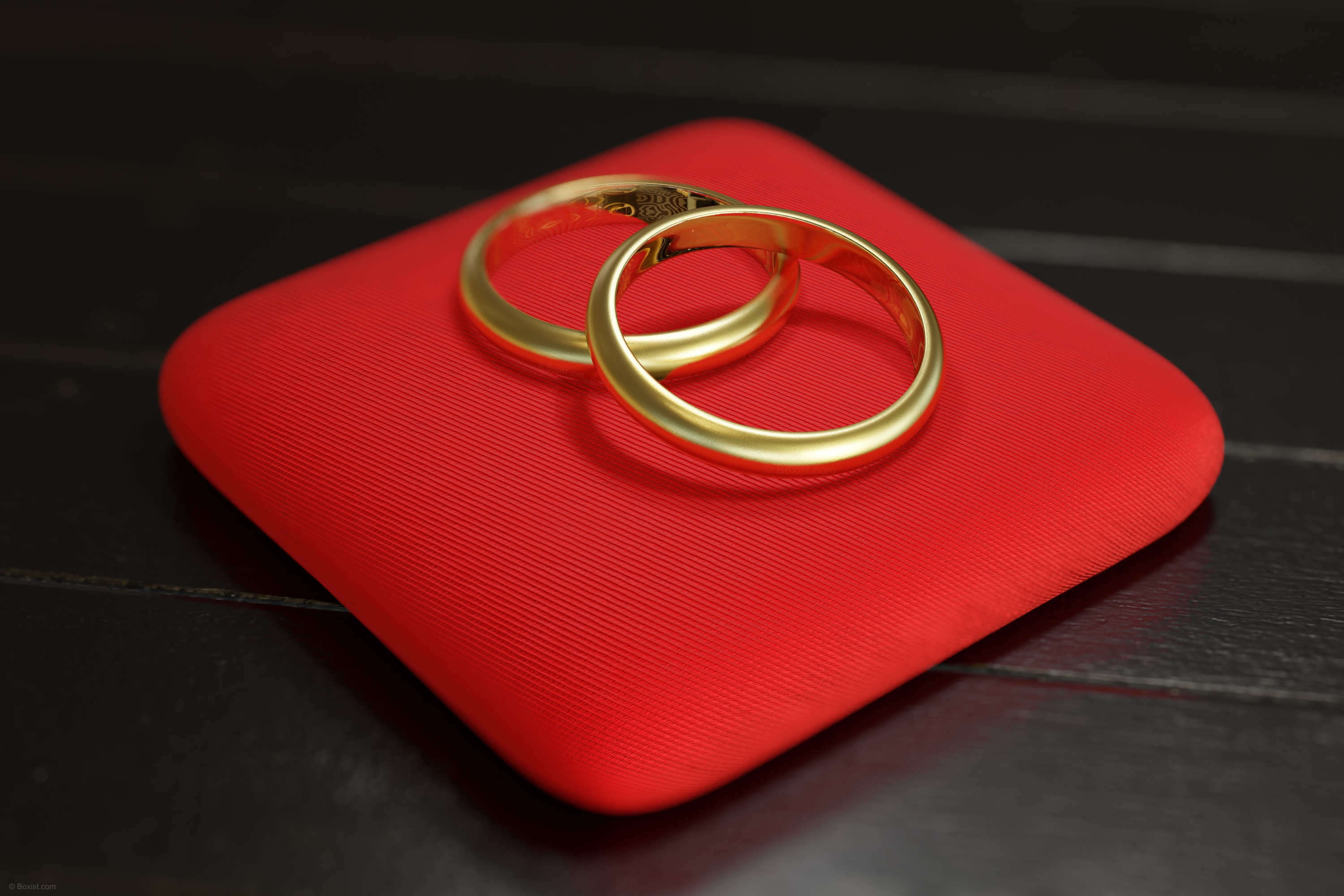 In this close-up image, we are presented with a scene of elegance and symbolism. Two shiny golden wedding rings are delicately placed on top of each other in a graceful manner. The rings, representing the eternal bond of marriage, gleam with a lustrous shine against the dark wooden planks surface. Beneath the rings, a small piece of red fabric serves as a pillow, providing a soft and luxurious backdrop. The rich red hue contrasts beautifully with the golden rings, adding warmth and depth to the composition. This image captures the timeless beauty and significance of marriage, inviting viewers to reflect on the enduring commitment and love shared between partners. It serves as a reminder of the sacred union formed by marriage and the journey of life and love embarked upon together.