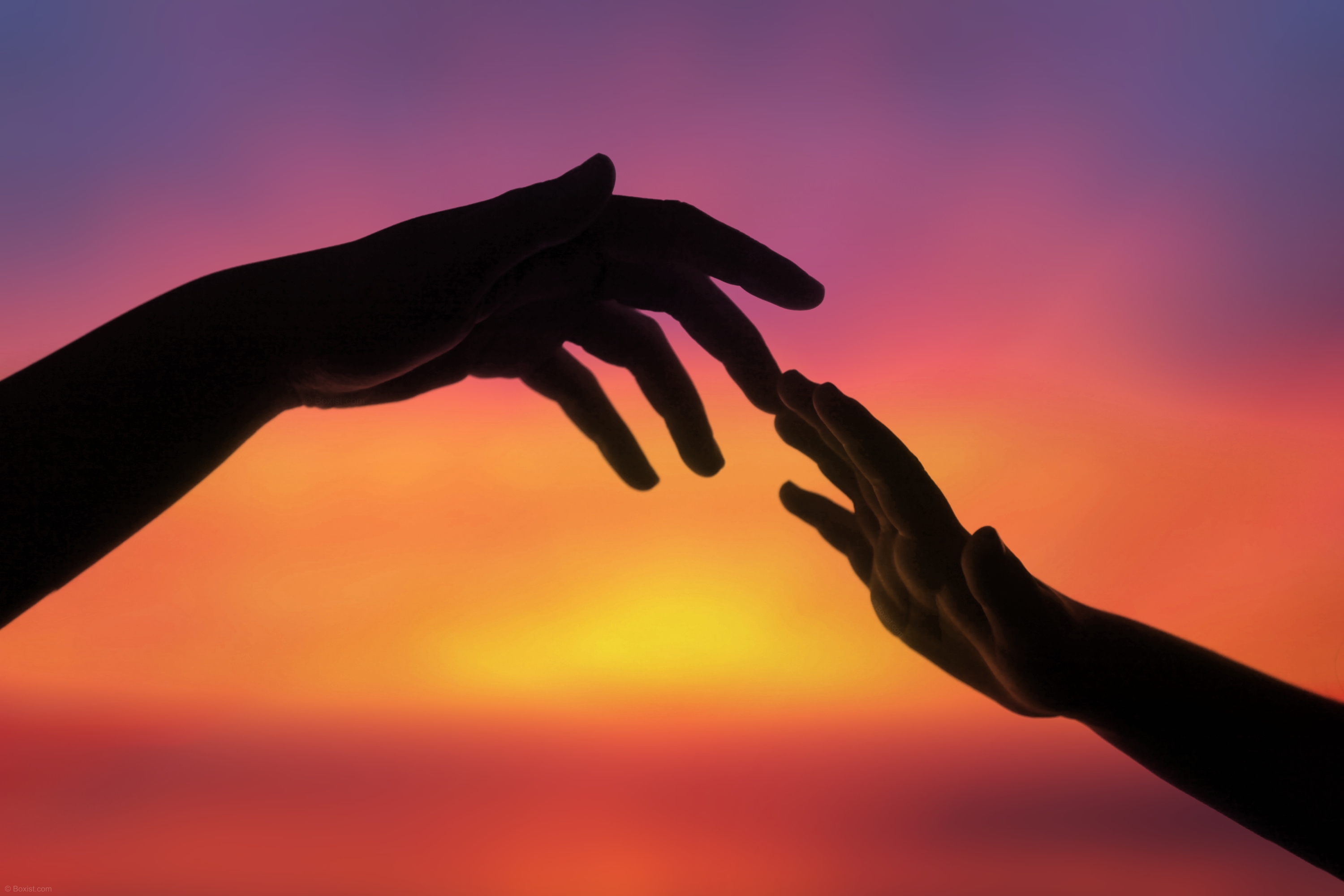 In this image, the silhouette of two hands reaching for each other stands out against a vivid and blurry sky background. The larger hand, representing that of a parent, stretches downward, while the smaller hand of a child reaches upward in an attempt to touch it gently. The contrast in size between the two hands symbolizes the bond between a parent and child, as well as the protective and nurturing nature of the parent. The gesture of reaching out suggests a desire for connection, comfort, and reassurance. Against the backdrop of the vibrant sky, the scene takes on a poetic and emotive quality, evoking feelings of warmth, love, and security. The blurry background adds to the sense of depth and atmosphere, creating a dreamy and ethereal ambiance. Overall, this view captures the essence of the bond between parent and child, highlighting the universal themes of love, care, and support. It serves as a poignant reminder of the importance of connection and intimacy in our lives, as well as the enduring power of familial relationships.